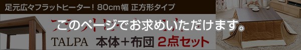 フラットヒーターこたつ【-Talpa-タルパ】正方形タイプ(80cm幅)+布団セット ![]() フラットヒーターこたつ【-Talpa-タルパ】丸型タイプ(直径85cm)+布団セットはこちら ![]() |