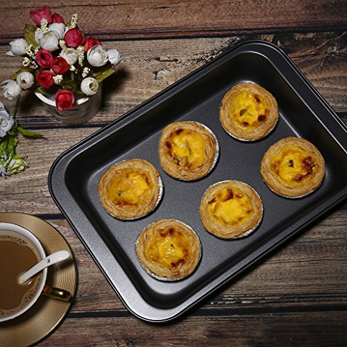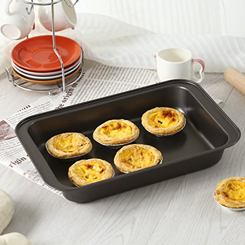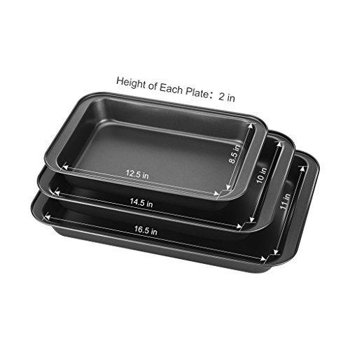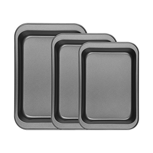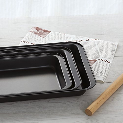 This Finether 3-piece nonstick baking sheets set is perfect for the avid baker. 3 sizes baking pans included for your diverse baking needs. All the pans in the set are constructed from heavy-duty metal allowing good heat conduction and even heat distribution, with thick rolled edges preventing wrapping. The food grade non stick coating inside and out is safe and durable for free use, making the pans scratch and rust resistant while easy to release and clean up. Dishwasher safe and easy to maintain.