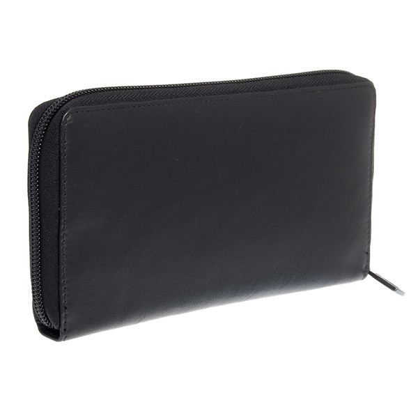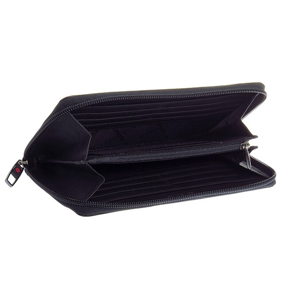 ラウンドファスナー、札入れ×2、ファスナー式小銭入れ×1、カード入れ×12、ポケット×2、カラー:ブラック