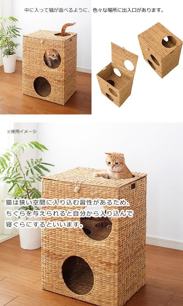 fk094igrjs中に入って猫が遊べるように、色々な場所に出入口があります サイズ (約)W45×D35×H60cm 個装サイズ:37.0×47.0×63.0cm 重量 約3kg 個装重量:4000g 素材・材質 ウォーターヒヤシンス 仕様 完成品 空間内寸:約W43×D33×H28cm(上下各) 穴の直径:約7cm(前面下部のみ約8cm) 付属品 取扱説明書 生産国 ベトナム 出入り口がたくさんのキャットプレイハウス 中に入って猫が遊べるように、色々な場所に出入口があります