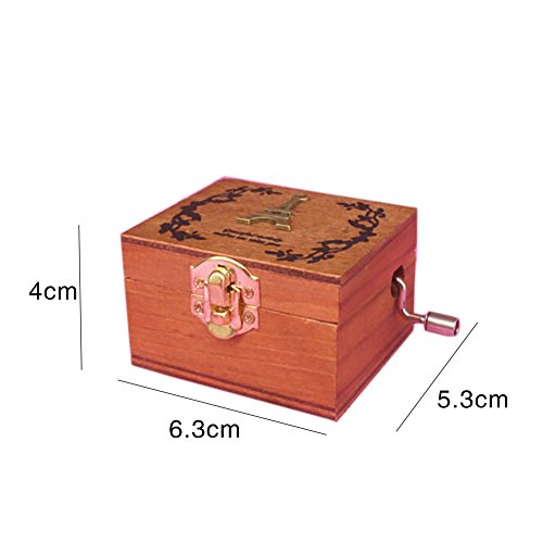 Futures: Dimension: Approx 2.48*2.48*1.57 in Material: Wooded Type:Owl The sound power from Spring.Use the bottom key to turn the Spring tightly,then release and will be playing,Please do not wind up too tightly,otherwise it may damage the movement Package Included:1 * Music box 0