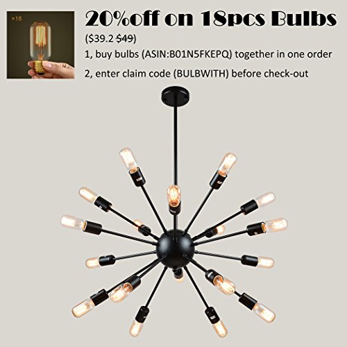 18 bulbs surround a black painted finish metal ball in the center, add vintage character to any interior with its trendy look, especially gorgeous for a living room, dining room, but also beautiful for the cafe bar. Industrial sputnik arm with lamp socket and bare shade reveal and maximize vintage Edison bulb light.
