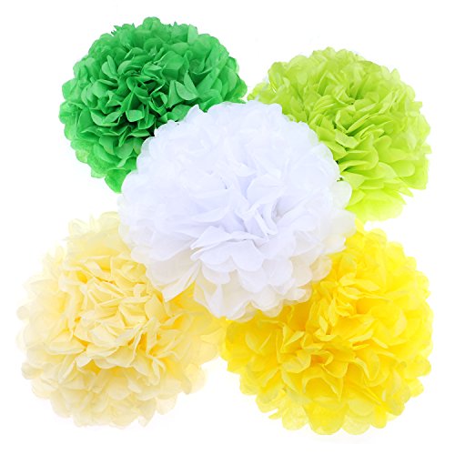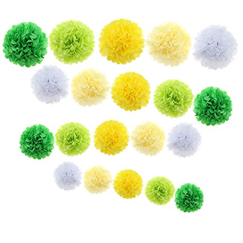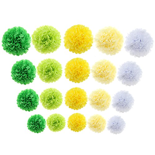 Each set comes with 20 piece paper pompoms totally five colors, includes - Green, Light Green, Yellow, Light Yellow, White, each color has 4 size - 10 Inches, 8 Inches, 6 Inches and 4 Inches.
