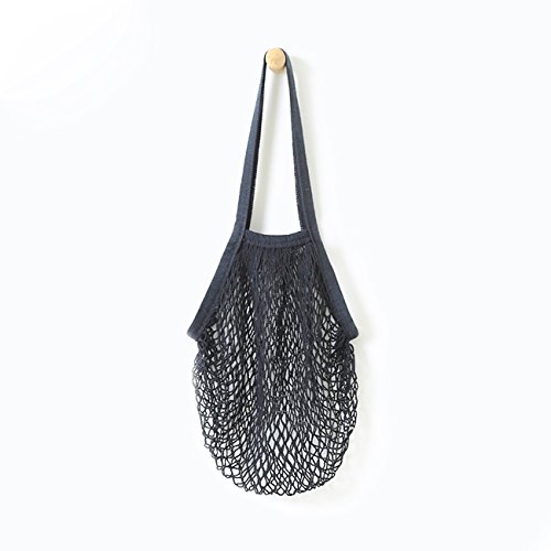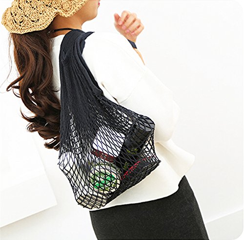 Convenient Portable Shopping Mesh Bag Cotton Net String Bags Reusable Organizer Tote Handbag Fruit Storage Grocery Shopper Woven Shoulder Ecology Produce Bags Long Handle Totes (Black)