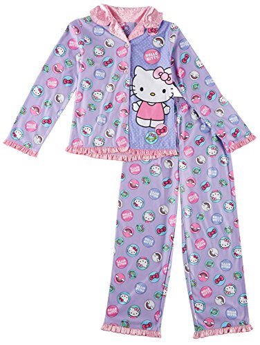 She is bright and beautiful in these Hello Kitty pajamas. Long sleeve pajama top features an adorable Hello Kitty logo and dots graphic, button-up closure, and a ruffled trim. Set includes a coordinating pair of pajama pants with elastic waist. 100% Polyester.Feature