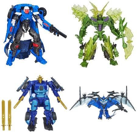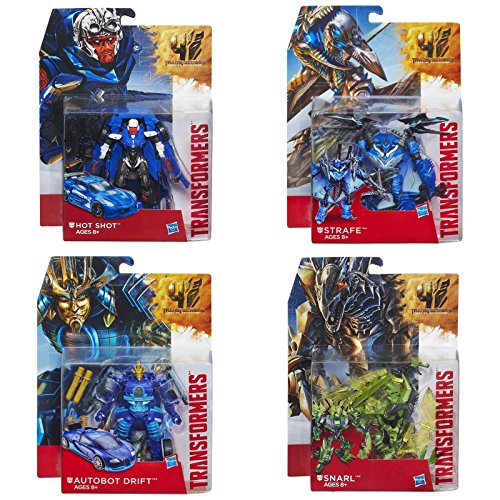-. Binding : Toy -. Brand : Hasbro -. EAN : 0093212345632 -. Feature : Bundle Includes 2-in-1 Autobot Drift figure converts from robot mode to speedy sports car mode and back Volkswagen Bugatti mode Includes blaster Changes in 16 steps Includes figure and accessories Autobot Drift used to fight for the Decepticons. Now, he wields his swords against them, alongside the heroic Autobots! Convert, arm and attack with all the Transformers action you can handle! This Autobot Drift figure is a high-powered fighter whether he's in robot mode or Bugatti mode. With a sword in each hand, he'll be a match for any enemy in robot mode. And when he converts to super-fast Volkswagen Bugatti mode, no enemy can hope to escape him! Keep converting him back and forth so he can handle whatever his foes dish out! Transformers and all related characters are trademarks of Hasbro. / 2-in-1 Strafe figure converts from robot mode to dino mode and back Pteranodon mode Includes 2 swords Changes in 13 steps Includes figure and accessories This flying Dinobot strikes fear in his enemies when he swoops down on them from above! Convert, arm and attack with all the Transformers action you can handle! This Strafe figure is a high-powered fighter whether he's in robot mode or dino mode. With a sword in each hand, he'll be a match for any enemy in robot mode. And when he converts to vicious pteranodon mode, no enemy can hope to outrun him! Keep converting him back and forth so he can handle whatever his foes dish out! / 2-in-1 Snarl figure converts from robot mode to dino mode and back Stegosaurus mode Changes in 15 steps Deluxe Class Series M4 No.010 Snarl Includes figure Snarl lives up to his name. If you see him smile, it usually means he's about to turn you into a pile of scrap metal. The thrill of battle is the only thing that makes him happy. Convert, arm and attack with all the Transformers action you can handle! This Snarl figure is a high-powered fighter whether he's in robot mode or dino mode. Weapon in hand, he'll be a match for any enemy in robot mode. And when he converts to hardcore stegosaurus mode, no enemy can hope to handle his charges! Keep converting him back and forth so he can handle whatever his foes dish out! / 2-in-1 Hot Shot figure converts from robot mode to sports car mode and back Corvette mode Changes in 12 steps Deluxe Class Series M4 #011 Hot Shot Includes figure The only thing Hot Shot likes more than winning is winning and going home a hero. The fearless Autobus will charge into any situation, blasters firing at every target in sight. Convert, arm and attack with all the Transformers action you can handle! This Hot Shot figure is a high-powered fighter whether he's in robot mode or sports car mode. With a blaster in each hand, he'll be a match for any enemy in robot mode. And when he converts to super-charged Corvette mode, no enemy can hope to escape him! Keep converting him back and forth so he can handle whatever his foes dish out! -. Label : Hasbro -. Manufacturer : Hasbro -. PackageQuantity : 1 -. ProductGroup : Toy -. ProductTypeName : TOYS_AND_GAMES -. Publisher : Hasbro -. Studio : Hasbro -. Title : Transformers Age of Extinction Generation Deluxe Class Autobot Drift, Strafe, Snarl & Hot Shot Figure Bundle -. UPC : 093212345632