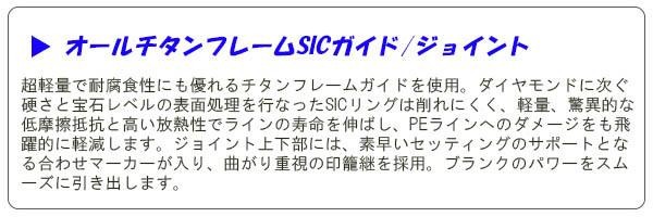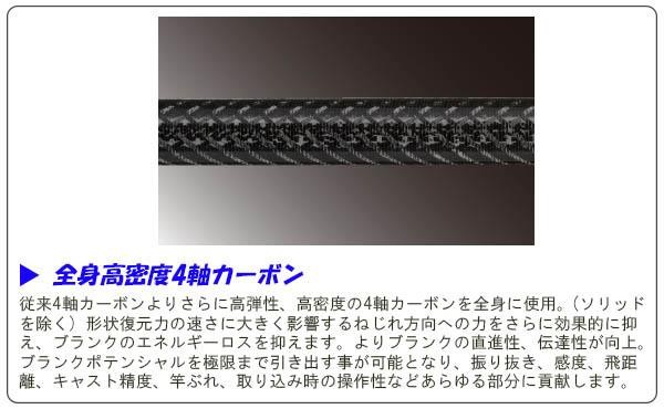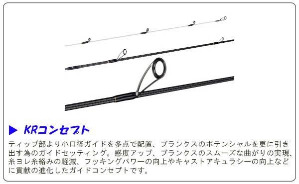 | 仕様 | 全身高密度4軸カーボン(ソリッド部を除く) タフトップ穂先 オールチタンフレームSICガイド(LGST&K&KLガイド) KRコンセプト ジョイント合わせマーカー付 継数:2本 Lure:0.5-8g Line:2-6lb. カーボン含有率:99% |