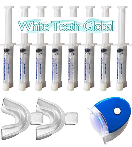 -. Binding : Health and Beauty -. Brand : White Teeth Global -. EAN : 0700358769641 -. Feature : 8 Syringes of 3cc of 22% (Top Strength) Carbamide Peroxide Teeth Whitening Gel / 1 LED Tooth Whitening Light / 2 Thermoforming Mouth Trays for Teeth Whitening / 1 Teeth Shade Guide to track your progress. / Our kits are MADE in the USA under FDA standards -. Label : Sunshine -. Manufacturer : Sunshine -. MPN : 8MLTS -. PackageQuantity : 1 -. PartNumber : 8MLTS -. ProductGroup : Health and Beauty -. ProductTypeName : HEALTH_PERSONAL_CARE -. Publisher : Sunshine -. Studio : Sunshine -. Title : Teeth Whitening at Home Kit with 8 Syringes 22% Tooth Whitening Gel, Mouth Trays and a Tooth Shade Guide -. UPC : 700358769641