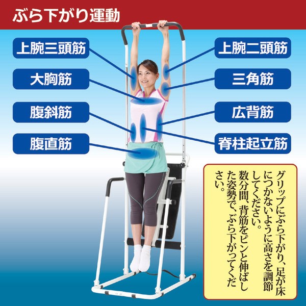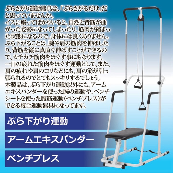 ぶらさがり運動器具は、「ぶらさがるだけ」だと思っていませんか。座ってばかりいると、自然と背筋が曲がった姿勢になってしまったり、筋肉が縮まった状態になるので、身体には良くありません。ぶら下がることは、腕や肩の筋肉を伸ばしたり、背筋を縦に真直ぐ伸ばすことができるので、カチカチ筋肉をほぐす事にもなります。一日の疲れた筋肉をほぐす運動として、また、肩の疲れや肩のコリなどにも、肩の筋が引っ張られるのでとてもスッキリするでしょう。本製品は、ぶら下がり運動以外にも、アームエキスパンダーを使った腕の運動や、ベンチシートを使った腹筋運動(ベンチプレス)ができる複合運動器具になってます。