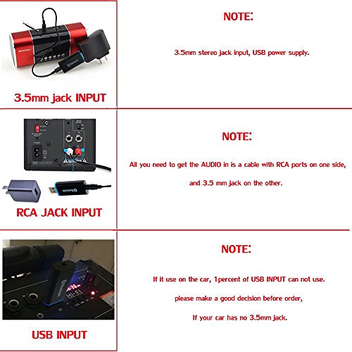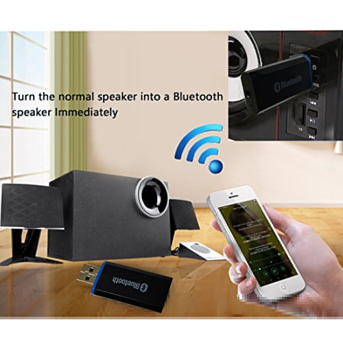 Features: Wireless Play:Removing troubles of wired connection,through the wireless connection and transmission,the user can enjoy a high fidelity music at any place indoor by wireless control Perfectly Compatible:Our products can be compatible with most of mobile phone or computer on the market.Support For iPhone,For iPad,iTouch and all kinds of smart phones. Portable Design:With mini size,the feature of portable can let you carry them to anywhere you want. Operation Steps: ?1. For no USB port Speakers---Supply power to the device by connecting charger with 5V USB interface,then connect the Speakers AUX port with the audio cable. ?2. For Speakers with USB port---Connect the device with speaker's USB port directly. ?3. Turn on the bluetooth function of computer, mobile or other device which has Bluetooth function,searching for the device to connect. ?4. After matching success, you can use your phone to play music