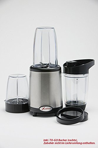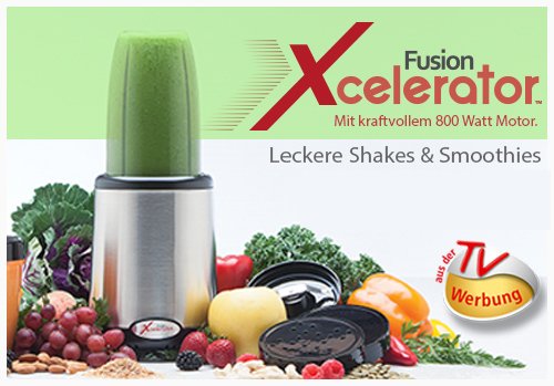 -. Feature : Bereiten Sie köstliche und gesunde Speisen in Sekunden zu. / Der Fusion Xcelerator zerkleinert die Lebensmittel bis auf Zellgröße, die wertvollen Nährstoffe und Vitamine bleiben erhalten. / Mit seinem kraftvollem 800 W Motor und den professionellen Klingen, arbeitet er effektiver als jeder Mixer. / Lieferumfang: Der Fusion Xcelerator - die Basis mit 2 verschiedenen Bechern (360/720 ml). 2 Edelstahl Klingen: Viererklinge (Kreuzklinge), besonders für Flüssigkeiten, Suppen und Smoothies geeignet, ideal zum Mixen, Pürieren und Vermischen. Zweierklinge (Schrotklinge) perfekt für die Verarbeitung trockener Zutaten, wie Nüssen, Kaffee, Gewürzen oder Korn. Rezeptbuch für zahlreiche leckere und gesunde Shakes und Smoothies. Der 10 Tages Kick-Off Plan, gesundes Abnehmen mit gesunder Ernährung. / Technische Daten: Fusion Excelerator Model FX 770, Motorleistung 800 W / 23.000 Rpm, 230 V - 50 Hz