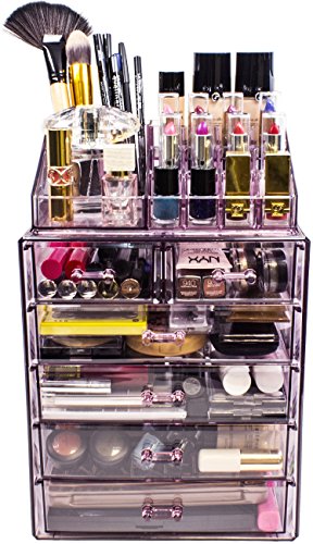 Find beauty in organization with the Sorbus® Acrylic Cosmetic Makeup and Jewelry Storage Case. It's pretty in purple and features acrylic construction to store your makeup and jewelry with an effortless view. Four drawers on the bottom unit are ideal for oversize cosmetics, toiletries, and grooming tools, while the top two drawers hold smaller items. It also includes 16 slots on the top portion to keep items such as brushes, lipsticks, eye pencils, and perfume bottles protected, upright, and in place. Drawers are perfect for storing palettes, foundations, bronzers, blushes, primers, powders, jewelry, accessories, keepsakes, and much more!