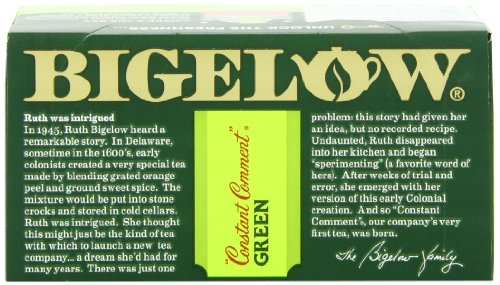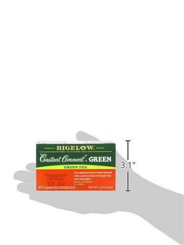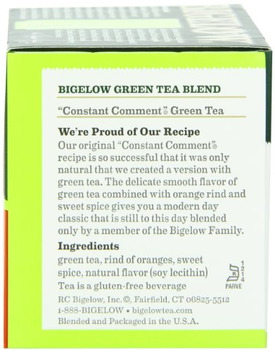 -. Binding : Grocery -. Brand : Bigelow Tea -. EAN : 0072310008052 -. Feature : Pack of six 20-count boxes of calorie-free green tea (120 total tea bags) / Hand-picked green tea flavored with orange rinds and sweet spice / Gluten free, with no calories and no carbohydrates; Kosher Parve / An excellent source of healthy antioxidants / Ships in Certified Frustration-Free Packaging -. IsAdultProduct : 0 -. Label : Bigelow -. LegalDisclaimer : Actual product packaging and materials may contain more and different information than what is shown on our website. We recommend that you do not rely solely on the information presented and that you always read labels, warnings, and directions before using or consuming a product. -. Manufacturer : Bigelow -. Model : 7231000805 -. MPN : 072310008052 -. NumberOfItems : 6 -. PackageQuantity : 6 -. PartNumber : 072310008052 -. ProductGroup : Grocery -. ProductTypeName : GROCERY -. PublicationDate : 2010-10-13 -. Publisher : Bigelow -. ReleaseDate : 2006-06-22 -. Size : 6 Pack -. Studio : Bigelow -. Title : Bigelow Constant Comment Green Tea, 20-Count Boxes (Pack of 6) -. UPC : 072310008052