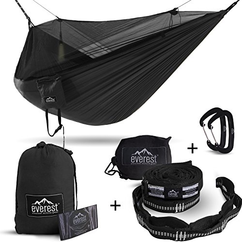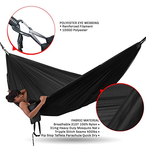 COMPLETE PACK – Includes Tree Saver straps super strong reinforced polyester filament webbing 1” wide 10 ft long 14 loops (28 combined) with triple stitch tack bars at 3” apart for ultra-fine tune rated at 400 lbs valued at over $25.00 plus a set of 2 mini Aluminum Lightweight no snag carabiners valued at over $15.00 and of course our Duo Swing Hammock with integrated heavy grade no-see-um netting, stuff pouch, compression straps and net rope.