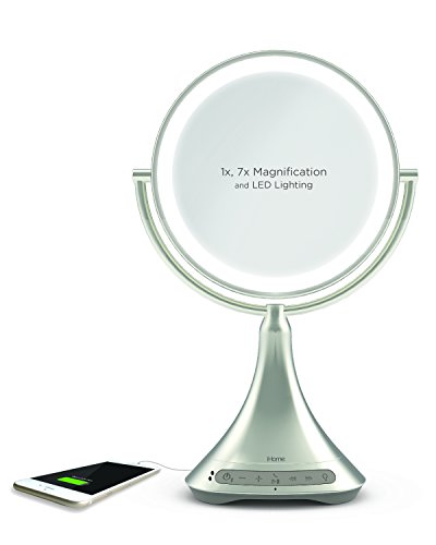 Look your best while enjoying your favorite music anywhere you like. USB port to charge mobile devices as you prepare for your day. The distortion free mirror has a 1x and 7x magnification for the best beauty routine and detailed grooming. Bright LEDs with high and low settings provide natural looking light for a look that's right in any situation. Stream audio wirelessly via Bluetooth from your mobile device. Built-in mic, digital voice echo cancellation and answer and end controls make speakerphone use a pleasure. Aux jack with included audio cable connects to most audio devices so you can enjoy your favorite music while getting ready. The bright LEDs and audio work independently while operating on internal rechargeable battery or AC adaptor.Feature