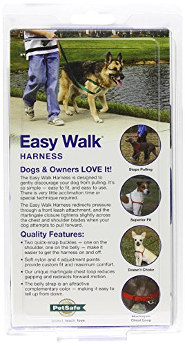 Product Description The latest innovation in pulling prevention the Gentle Leader Easy Walk Harness. Designed to gently discourage your dog from pulling while walking on a leash, the Easy Walk Harness is so simple easy to fit, and easy to use. Dogs AND owners love it! Never causes coughing, gagging or choking because the chest strap rests low across the breastbone. Includes a quick snap buckle on both the shoulder and belly straps for easy on and off. 4 points adjustment provides maximum comfort and a reliable fit.