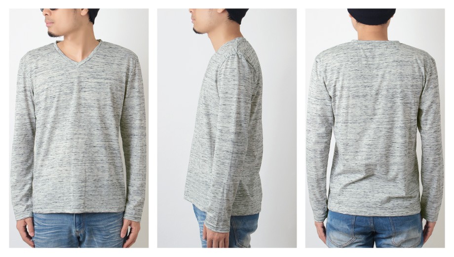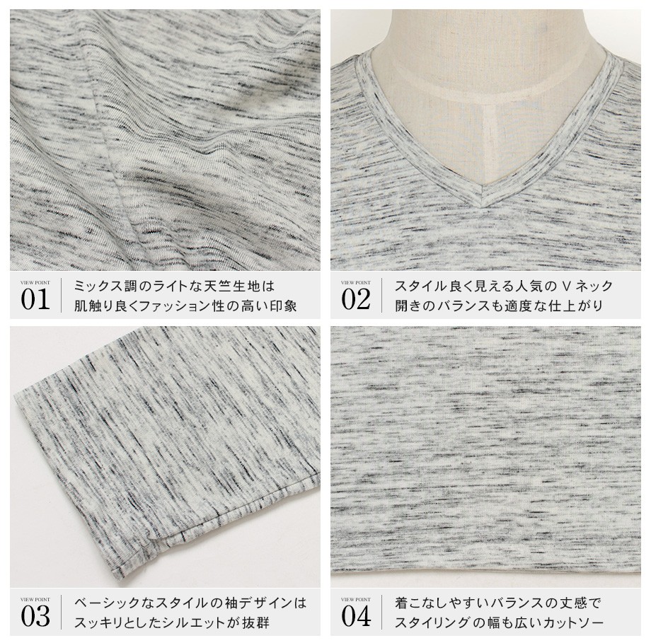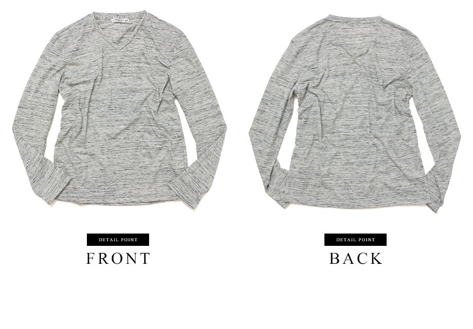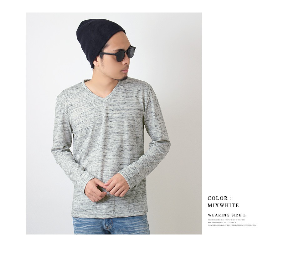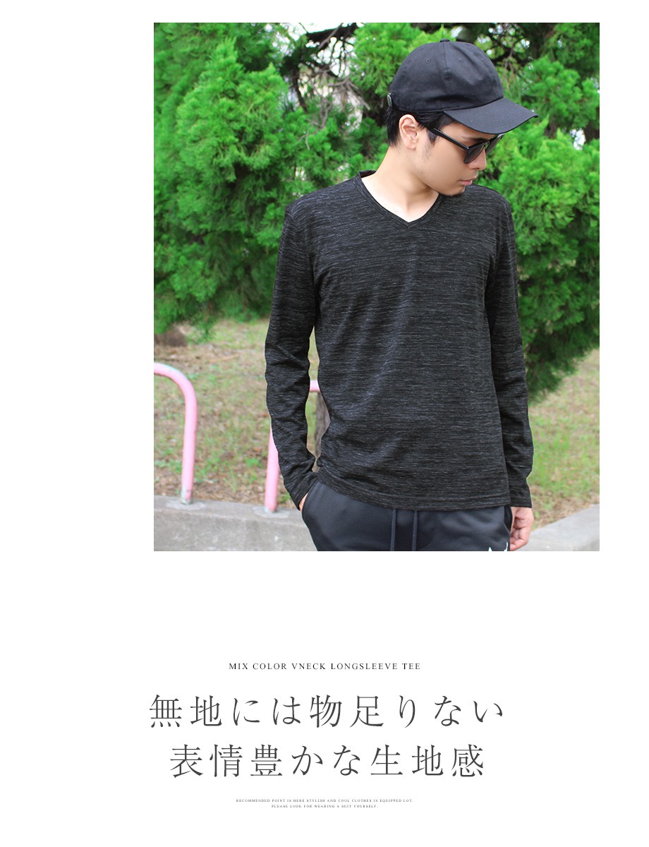 ミックスデザインが雰囲気あるシンプルデザインのVネック長袖Tシャツ。ライトな質感のカットソーで着心地も良くロングシーズン活躍してくれる仕上がりになっております。ファッション性のあるカットソーなので一枚でも様になるロンTでおすすめ。ラフなカジュアルスタイルにお使いいただけるアイテムです。