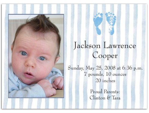 Studio : Storkie Express Publisher : Storkie Express Binding : Baby Product Product Description Birth Announcements: "Two Blue Feet" features your adorable new baby's photo on the left side of this classic design. Light blue stripes appear vertically on a white b 0