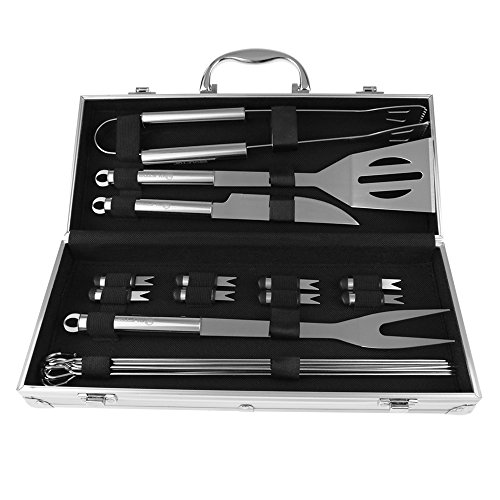 - FOOD-GRADE STAINLESS STEEL: This 18-piece barbeque grill set includes tongs, spatula, knife, fork, 6 x skewers and 8 x corn holders. All made of high-grade stainless steel material.