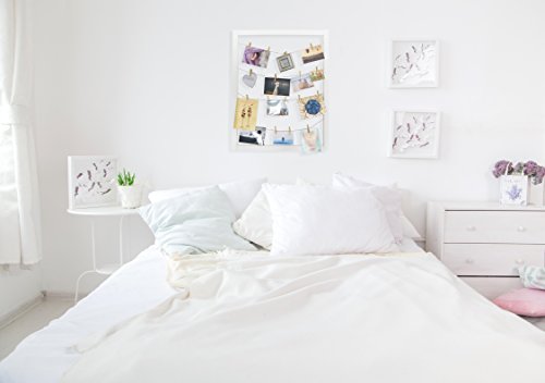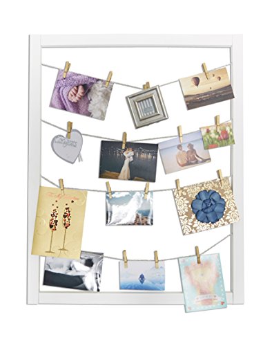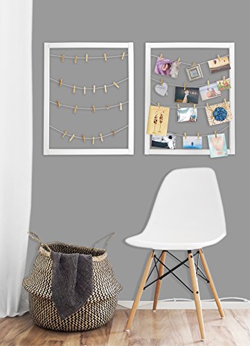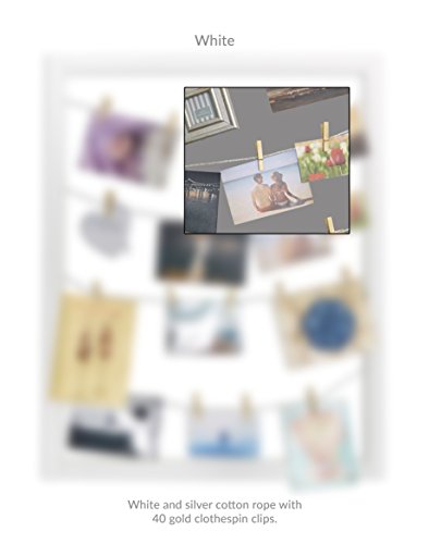 - CHOOSE FROM 3 UNIQUE DESIGNS WITH PREMIUM MATERIALS - The modern design comes in 3 colors with coordinating rope and 40 clothespins to secure your items- (1) Classic white frame with white and silver cotton rope and gold clothespins (2) Rustic Grey with cream faux suede cord and bronze clothespins (3) Gunmetal Grey with white and silver cotton rope and white and black chevron clothespins.