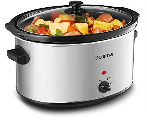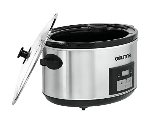 Programmable cooker has an easy-to-read digital LCD Panel with easy-to-read time and temperature settings with easy to use & ergonomically designed buttons. Low, High & Warm Temperature settings. See-through tempered-glass lid. Cool to touch handles for easy transfer. Features a removable oval shaped non-stick ceramic 8.5 Quart vessel which is large enough to cook food for a crowd and can go right to the table for serving. Machine automatically switches to keep Warm setting after cooking is complete to automatically keep the foods warm until serving time.Feature