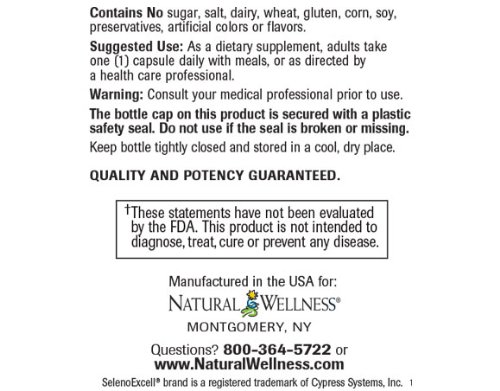 -. Binding : Health and Beauty -. Brand : Natural Wellness -. Feature : Selenium is an essential antioxidant that your body requires for important processes to occur and for your body to perform at its best. / Promotes normal liver, prostate and thyroid function and supports a healthy metabolism. / Powerful antioxidant that fights free radicals. High absorption rate allows it to start working faster than other selenium supplements / Made with SelenoExcell® - the most clinically researched source of organic selenium. 100% natural and organic. -. IsAdultProduct : 0 -. Label : Natural Wellness -. Manufacturer : Natural Wellness -. MPN : N408 -. PackageQuantity : 1 -. PartNumber : N408 -. ProductGroup : Health and Beauty -. ProductTypeName : HEALTH_PERSONAL_CARE -. Publisher : Natural Wellness -. Studio : Natural Wellness -. Title : Natural Wellness Selenium - SelenoExcel - 60 Capsules
