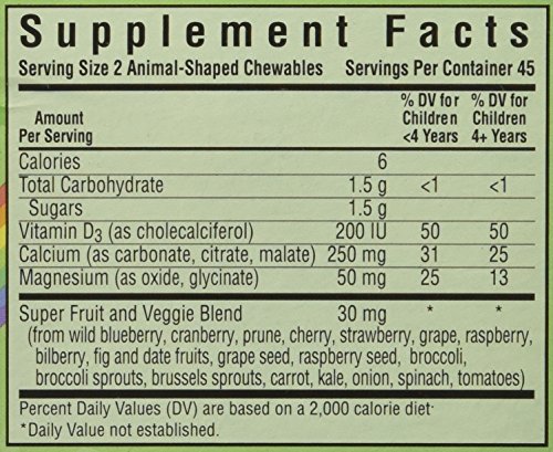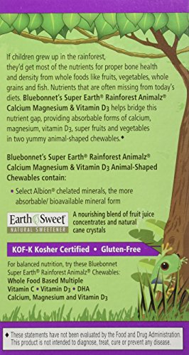 -. Binding : Health and Beauty -. Brand : Blue Bonnet -. EAN : 0743715001961 -. Feature : Contains Calcium, Magnesium, and Vitamin D3 / Gluten Free / Kosher friendly -. IsAdultProduct : 0 -. Label : BlueBonnet -. LegalDisclaimer : While we work to ensure that product information is correct, on occasion manufacturers may alter their ingredient lists.Actual product packaging and materials may contain more and/or different information than that shown on our Web site. We recommend that you do not solely rely on the information presented and that you always read labels, warnings, and directions before using or consuming a product. For additional information about a product, please contact the manufacturer. Content on this site is for reference purposes and is not intended to substitute for advice given by licensed health-care professionals such as physician,etc. Contact your health-care provider immediately if you suspect that you have a medical problem. Information and statements regarding dietary supplements have not been evaluated by the US FDA and are not intended to diagnose, treat, cure, or prevent any disease or health condition.Amazon.com assumes no liability for inaccuracies or misstatements about products. -. Manufacturer : BlueBonnet -. Model : 743715001961 -. MPN : 743715001961 -. NumberOfItems : 1 -. PackageQuantity : 1 -. PartNumber : 743715001961 -. ProductGroup : Health and Beauty -. ProductTypeName : HEALTH_PERSONAL_CARE -. PublicationDate : 2015-05-16 -. Publisher : BlueBonnet -. ReleaseDate : 2015-05-13 -. Size : 90 -. Studio : BlueBonnet -. Title : Super Earth Rainforest Animalz Calcium Magnesium & Vitamin D3 Natural Vanilla 90 chewables -. UPC : 743715001961