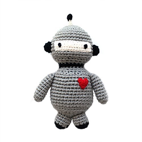 This rattle is an adorable Robot who has a cute face! Detailed and hand-crocheted, its shape is easy for little hands to hold, making it a perfect plaything for babies. Entirely hand crocheted using 100% organically grown and sustainably harvested bamboo. Bamboo yarn is soft, naturally antibacterial and non-allergenic. Makes a perfect organic and eco-friendly gift. Bamboo is also a renewable, sustainable resource. Cheengoo means "friend" in Korean! Designed in San Francisco, USA but lovingly hand-crocheted by a team of artisan women in China, mostly mothers and farmers working to provide their families with extra income for basic needs. Meets ASTM and CPSIA requirements.Feature