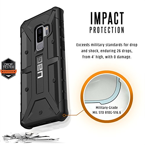 -. Feature : Feather-light cases feature our patented hard outer shell and soft impact resistant core / UAG Pathfinder Samsung Galaxy S9+ cases are Samsung Pay & Wireless Charging compatible / Soft raised rubber screen-lip and rear skid pads provide 360-degree protection for your Galaxy S9+ / Ultra-responsive tactile buttons deliver a crisp, clean click-feel for improved functionality / Meets military drop-test standards [MIL STD 810G 516.6] providing increased shock protection