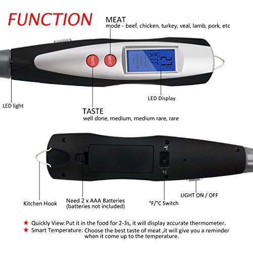- 【PROFESSIONAL MEAT THERMOMETER】MEAT includes beef, turkey, lamb, veal, chicken, pork, etc. TASTE includes well done, medium, medium rare and rare