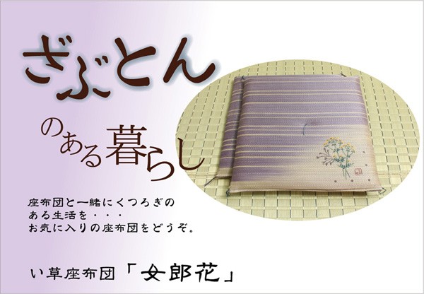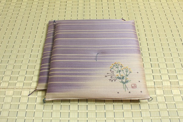 職人が1枚1枚手作業で捺染プリントを施したイ草座布団です。メセキ織という技法で柔らかい肌感触に仕上げました。またイ草の生地を縫製した後に、生地を湿らせ、裏返しにする『返し』という技法で仕上げております。イ草を通常曲げてはいけない方向に曲げますので、良い(太く強い)イ草でなければ作ることができません。返すことにより、ふっくらしたボリューム感を出しました。国産(九州産)のい草を使用しています。一本一本が太く、表皮が厚く繊維がキメ細かいので弾力性があり、耐久性に優れています。い草には空気の自然浄化作用、湿度の調節作用などがあります。また汚れにくく、使用するうちに黄金色に変化し味が出ます。い草に青森ヒバ加工を施しています(抗菌、防臭効果)。中材はウレタンをフェルトでサンドした三層構造で、適度なクッション性があります。※柄のプリントは職人が手作業で描く為、同じ色・柄であっても多少風合いが異なります。