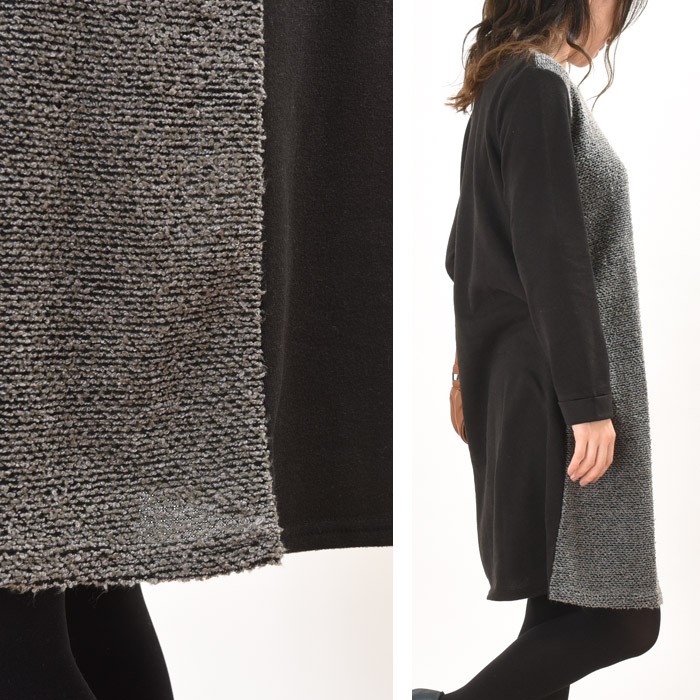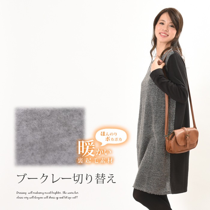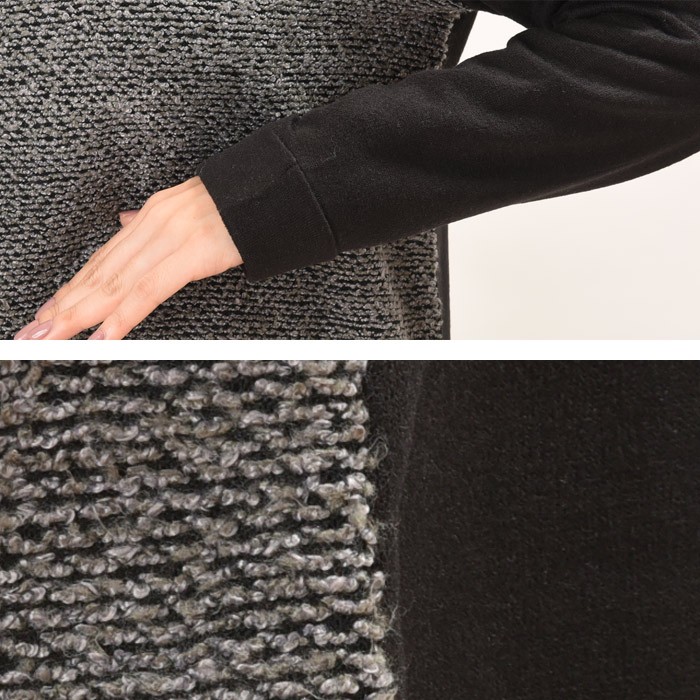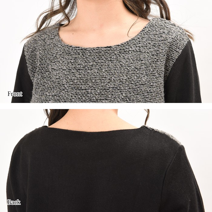 無地部分は、表面はふんわりとした触り心地、内側は起毛でふんわりあったかい、これからの時期にピッタリの裏起毛素材で、前身頃の切り替え部分は凹凸のような編み目が特徴なブークレー素材の異素材切り替えになっています。全体的にゆったりとしたシルエットなので、着心地が楽ちんで幅広い年齢層の方に大人気です♪シンプルな雰囲気なので、着回しがしやすく幅広いコーディネートに取り入れやすいデザインです。Mサイズ Lサイズ