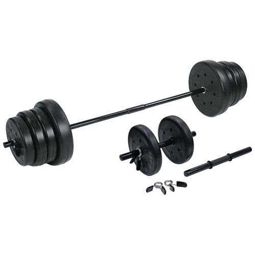 Also includes (6) locking spring clips, (2) dumbbell bars, and (1) 55-inch 4 lb. barbell bar