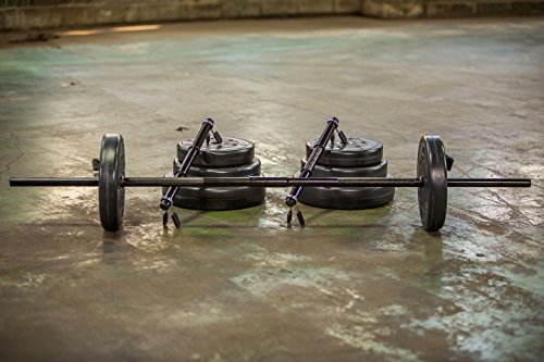 Heavy-duty barbell bar features textured, nonslip grip area (assembly required)