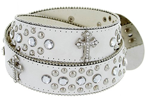 -. Binding : Apparel -. Brand : Belts.com -. Department : mens -. Feature : 1.5" wide genuine leather strap with tons of shiny studs and rhinestones / Engraved western style buckle set with sparkling rhinestones / Available in sizes from 32" to 40" / Sizes measured from end of strap, where it meets the buckle, to middle hole at the tip end -. ProductGroup : Apparel -. ProductTypeName : ACCESSORY -. Title : Western Crystal Rhinestone Cowgirl Studded Black Leather Cross Concho Belt