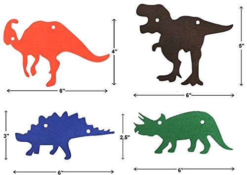 -. Feature : Ideal for decorating walls, windows, mantels and party tables;Can be hung on string / Dinosaur Theme Kids Birthday Party Decoration / 100% Money Back Guarantee / Each dinosaur approx: 6"L x 4.0"W; With our OWN special package / Package:4 colors dinosaurs orange blue green brown,total 8 premium quality non-woven fabric +1 string