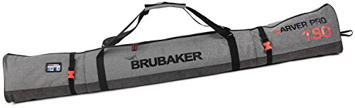 BRUBAKER Padded Ski Bag 'Carver Performance' For all carving, racing and all-mountain skiing equipment - this bag in fabric and artificial leather finish can carry one pair of ski up to a length of 190 cm (74 3/4") or up to up 170 cm (66 7/8") and poles. Two adjustable shoulder straps with a padded handle makes it easy to transport the equipment in this lightweight bag. Easy to load with the continuous strong 2-way front zipper. Compression straps adjusts the ski and poles in the bag. The Area around the ski bindings is foam padded and coated with cut-resistant fabric. The ventilation eyelets ensures optimum air circulation. With address tag at the outside of the bag. Dimensions: