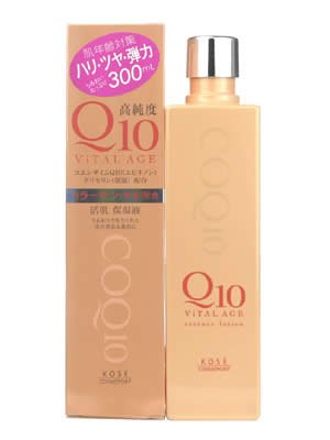 -. Binding : Health and Beauty -. Brand : COSMEPORT -. EAN : 4971710308914 -. Feature : Co-enzyme Q10 serves as an energy source to encourage skin's natural processes to give tired looking skin new life and shine. / Features natural marine collagen, known to have significant moisturizing benefits in preventing dry skin and wrinkles. / Made in Japan, comes with English usage instructions and ingredients. -. IsAdultProduct : 0 -. Label : KOSE -. Manufacturer : KOSE -. MPN : 4971710308914 -. PackageQuantity : 1 -. PartNumber : 4971710308914 -. ProductGroup : Beauty -. ProductTypeName : HEALTH_PERSONAL_CARE -. Publisher : KOSE -. Studio : KOSE -. Title : Vital Age Q10 Facial Lotion (Toner) by Kose Cosmeport - 300ml