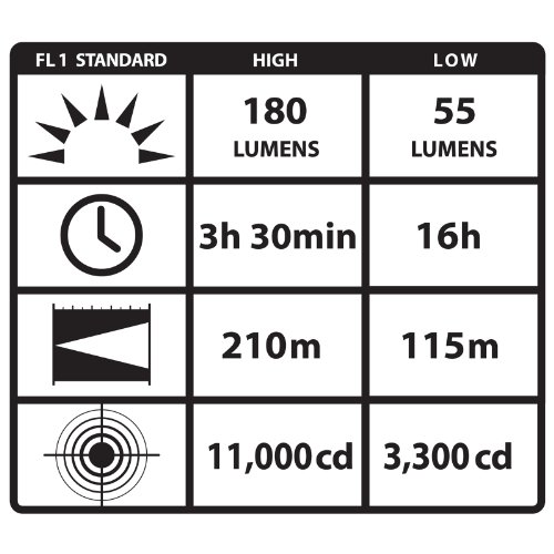 The Knucklehead spot light features a spot light with C4 premium LED technology for extreme brightness, impervious to shock with a 50,000-hour lifetime. A single parabolic reflector with a tighter beam allows for longer range target illumination. Optimized electronics provide regulated intensity. The Knucklehead features four light modes: High with 11,000 candela peak beam intensity and 180 lumens; Low with 3300 candela peak beam intensity; and 55 lumens with Moonlight and Flash.