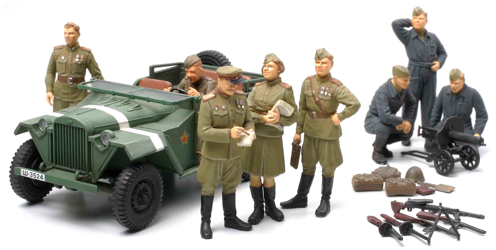 Driver dolls and Maxim heavy machine guns, sets of accessories including sub machine guns and so on.