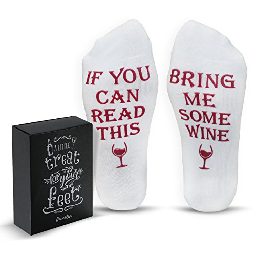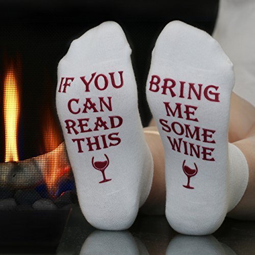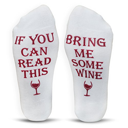 Studio : Cavertin Publisher : Cavertin Product Description KEEP YOUR FEET WARM YOUR GLASS FULL with these special "If you can read this, bring me some wine" socks. PERFECT GIFT WITH GIFT BOX for the wine lover in your life (even if it's yourself) for every occasion! Whether you need a memorable birthday present for your best friend, wife, girlfriend, mom, sister or coworker we've got you covered. They'll enjoy them for years. Need a cool gift for a bridal shower, housewarming, or hostess party? Your search is over! Funny "bring me some wine" socks are also great for Christmas gifts, holiday office parties, stocking stuffers and dirty santa / white elephant gift exchanges. Beautiful gift box included to make this gift even more special. HIGH QUALITY Machine washable comfy socks made of high quality cotton with non slip grip. TIPS Have a couple of them on hand for an "emergency". Imagine their face when they open the box to find this hilarious pair of socks. They'll laugh and think of you every time they put on the socks and take a sip of their favorite wine. Get these awesome wine socks today and be ready to receive many compliments. 100% SATISFACTION GUARANTEED - If you are not satisfied with your purchase for any reason, we will give your money back. That easy! Click "add to cart" to order. 0