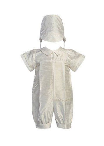 Handsome silk romper with two button d?cor, collar and hat. Perfect for christening, baptism, dedication, blesssings and weddings. (Please note that all natural silk fabrics have slubs which are an inhearent part of the fibers and add to the individuality of the set. These should not be mistaken for flaws in the fabric.)Feature