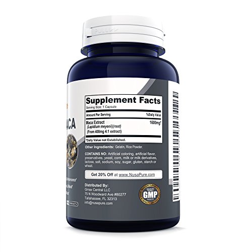 -. Feature : ✅ ✅ ✅ MAX STRENGTH BLACK MACA (NON-GMO): NusaPure's maximum strength Black Maca root extract supplement contains 1600mg of Peruvian sourced Black Maca per serving, and 200 capsules in each bottle for a full 200 day supply. Black Maca (Lepidium Meyenii) is an herb native to the Andes Mountains in Peru. Don't settle for other tablets or pills that only offer 500mg of Black Maca per dose, or that only give you 90 or 120 capsules per bottle. * / ✅ ✅ ✅ BLACK MACA - THE SUPERIOR MACA: Peruvian sourced Black Maca has many benefits that make it a superior choice for men, as opposed to red or yellow maca extract / powder. Black Maca supports enhanced male potency & fertility, helps enhance libido & sex drive, and supports strength, stamina & energy. Additionally, Black Maca supports muscle building and athletic performance, may help with natural testosterone production, and helps balance your mood. * / ✅ ✅ ✅ LOOK FOR STRENGHT: Our potent extract formula contains 1600mg of Peruvian sourced Black Maca per capsule. Black Maca is superior because it utilizes a boiling process to remove starch content, and is therefore typically easier to digest. Additionally, Black Maca contains more concentrated nutrient content, and amplified metabolites & minerals. * / ✅ ✅ ✅ BEST VALUE ON AMAZON: Our Peruvian sourced Black Maca formula is backed by our 100% Money Back Guarantee for 30 Days. Each bottle contains 200 capsules, each containing 1600mg of pure Black Maca (1600mg per serving). Our potent complex is made in the USA, in an FDA registered and GMP compliant facility, is All Natural. / ✅ ✅ ✅ COMMON NAMES & FORMS: Maca root comes in several colors including black, yellow and red. Black Maca (Lepidium Meyenii) root supplements are often bought by men. Black Maca can be found in capsules, powder, pills, soft gels, tablets, raw, liquid, drops, droplets, extract, and cream. Black Maca is frequently bought with NusaPure Horny Goat Weed or NusaPure Black Cumin Seed Oil 500mg. *