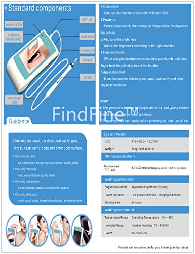 - Feature : Useful Visual Inspection Instrument.High quality mini otoscope. Invaluable for everyday ear nose and throat use.Perfect for doctors, nurses, students, and in home use. This product is an essential tool for each family, each classroom in school, Pet Hospital. / Factory Outlet. This Product Can't taking photos and videos in real time.NO SD CARD INSIDE. / Application field It is widely used for family healthcare, beauty salon, ophthalmology and stomatology department, gift shop, etc. It can be used for examination of ear canal, oral cavity and other physical conditions. Warm Tips: 1. This product is not a medical device. 2. This product is suitable for people above 14, and young children should use it under parental guidance. 3. Please connect the handle before powering on, and turn off the power before unplugging the transmission cable. / Unique 3.8mm micro lens , LED light with five-level adjustable brightness. The handle is made of waterproofing material, reaching to IP65 level, which can be soaked in and sterilized with alcohol. 1200mA battery and long standby time. 3.0?¡ÀLCD monitor, 5 times of HD images. The probe is designed according to the human ear length, which is comfortable and safe. / The visual otoscope inspects the target with the using of tiny HD cameras. And the results are displayed on the portable monitor through the photoelectric signal transmission. It can tell the ear canal health status , which could not be observed by common methods. It can also check other body parts, such like scalp, pores, comedones, ear canal, oral cavity, nasal cavity and so on. Ergonomic design and elegant in fashion.