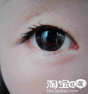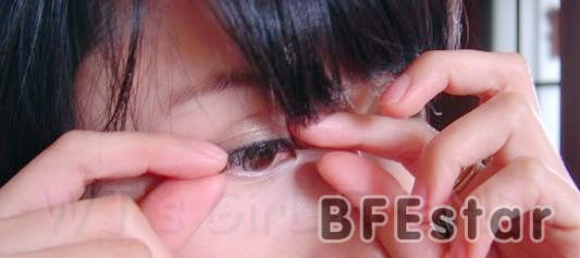 2. 微闭眼睛,寻找自己的眼线,如果已经是双眼皮了,就贴在那条缝的上面(这样可以让眼睛看起来更大).如果是单眼皮,就得寻找一下合适的位置了,一般贴在距离睫毛上0.5CM处.
