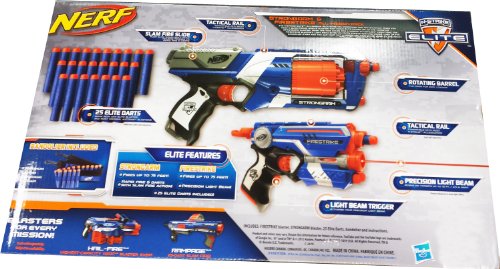 -. Feature : Strongarm: Fires darts up to 75',Pump the Slam Fire slide repeatedly while you hold down the trigger for rapid firing / Flip open the rotating barrel for easy loading,Elite darts work with any Elite blaster and most N-Strike blasters / Firestrike: comes with Light Beam targeting,Precision Light Beam works on targets up to 15 feet away / Pack comes with 25 Elite Darts and instructions / Bandolier Strap included
