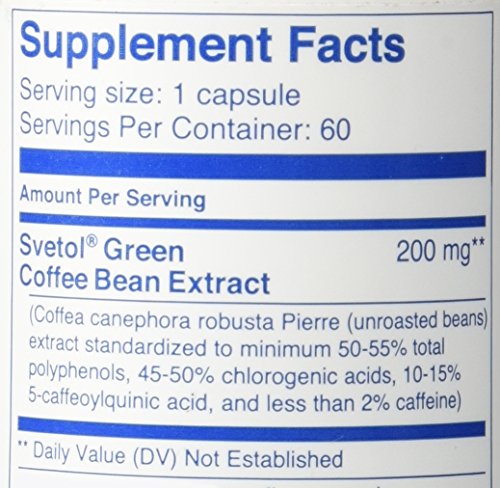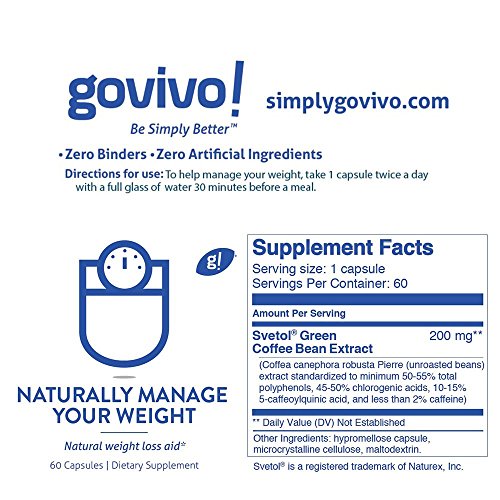-. Binding : Health and Beauty -. Brand : Govivo -. Label : Govivo -. Manufacturer : Govivo -. ProductGroup : Health and Beauty -. ProductTypeName : HEALTH_PERSONAL_CARE -. Publisher : Govivo -. Studio : Govivo -. Title : Pure SVETOL Green Coffee Bean Extract - All natural Weight loss supplement with Antioxidant GCA | 30 day supply with 60 capsules by Govivo