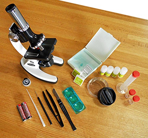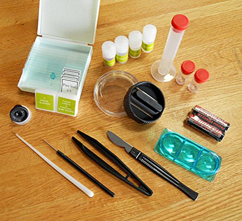 50+ science accessories: 2 AA battery, shrimp hatchery, micro-slicer, 5 prepared glass slides+7 blank glass slides, 7 cover glasses, 7 slide labels, 7 statical slide covers, petri dish, replacement light bulb, scalpel, needle, stirring rod, graduated vials, 2 collecting vials, tweezers, gum media container, sea salt, eosin dye, Brine shrimp egg.
