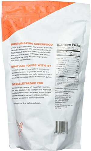ReleaseDate : 2017-08-28 Studio : Bulletproof Publisher : Bulletproof Binding : Health and Beauty Product Description Bulletproof Cacao Butter 1 lb. is designed to be the highest quality chocolate. All chocolate is produced by fermentation, and 80% of South American chocolate sampled recently had mold contamination. 64% of the microbes that ferment chocolate create toxins called mycotoxins. These toxins, even at so-called 'safe' levels approved for commodity chocolate, contribute to feelings of weakness, sickness, and lethargy. For regular chocolate, the health benefits don't outweigh the risks. That's why we made Upgraded Cacao Butter using an optimized process to create chocolate without the toxins that make chocolate such a common source of problems. Eating a high quality source of dark chocolate, like Upgraded Cacao Butter, has tons of benefits. People who eat high quality chocolate have lower markers of inflammation than those who eat regular chocolate. Studies indicate people who consume the highest amounts of dark chocolate are at least 53% more likely to experience enhanced cardiovascular health. 0