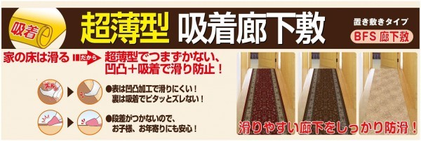 fk094igrjs商品が薄く、廊下敷と床との段差が出来ないので、つまづきがありません。裏面に吸着加工をしているのでずれません。表面に凸凹の型を付けているので、滑りにくいです。
